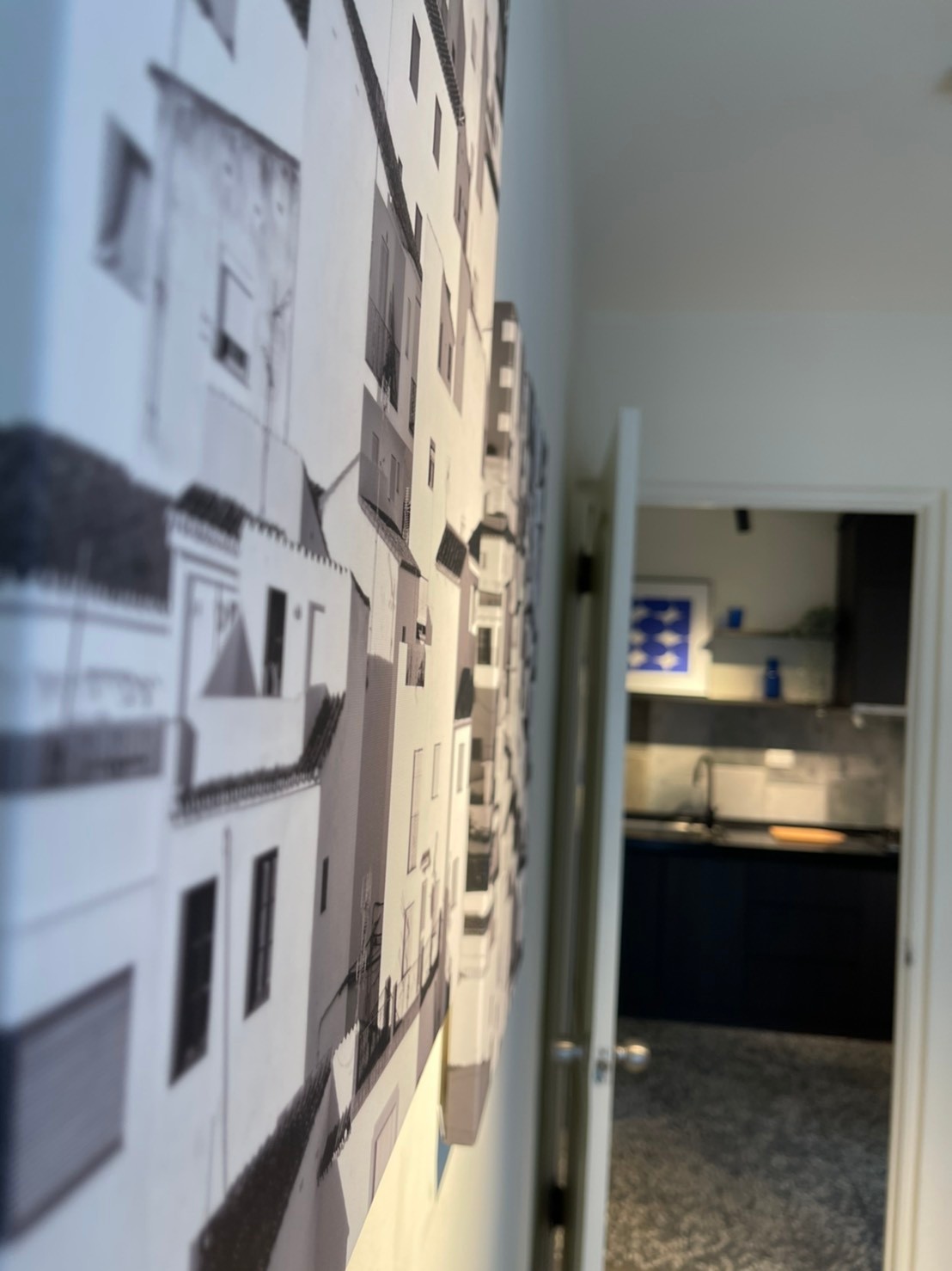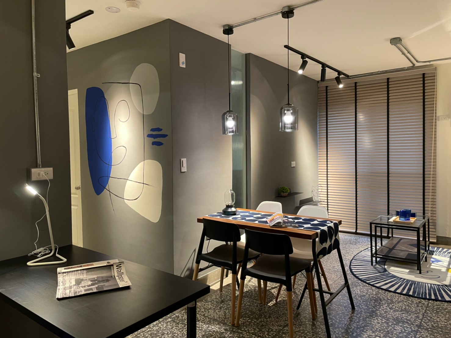 保留這個充滿懷舊氛圍的磨石子地板,佐以牆面抽象手繪和亮麗的萊茵藍,賦予了老屋新的靈魂,注入了一股新的能量!原來,舊與新、歷史與現代能如此被和諧的整合在一起,不僅讓人眼睛為之一亮,也隨即融入、放鬆於這個深具特色的小巧空間!