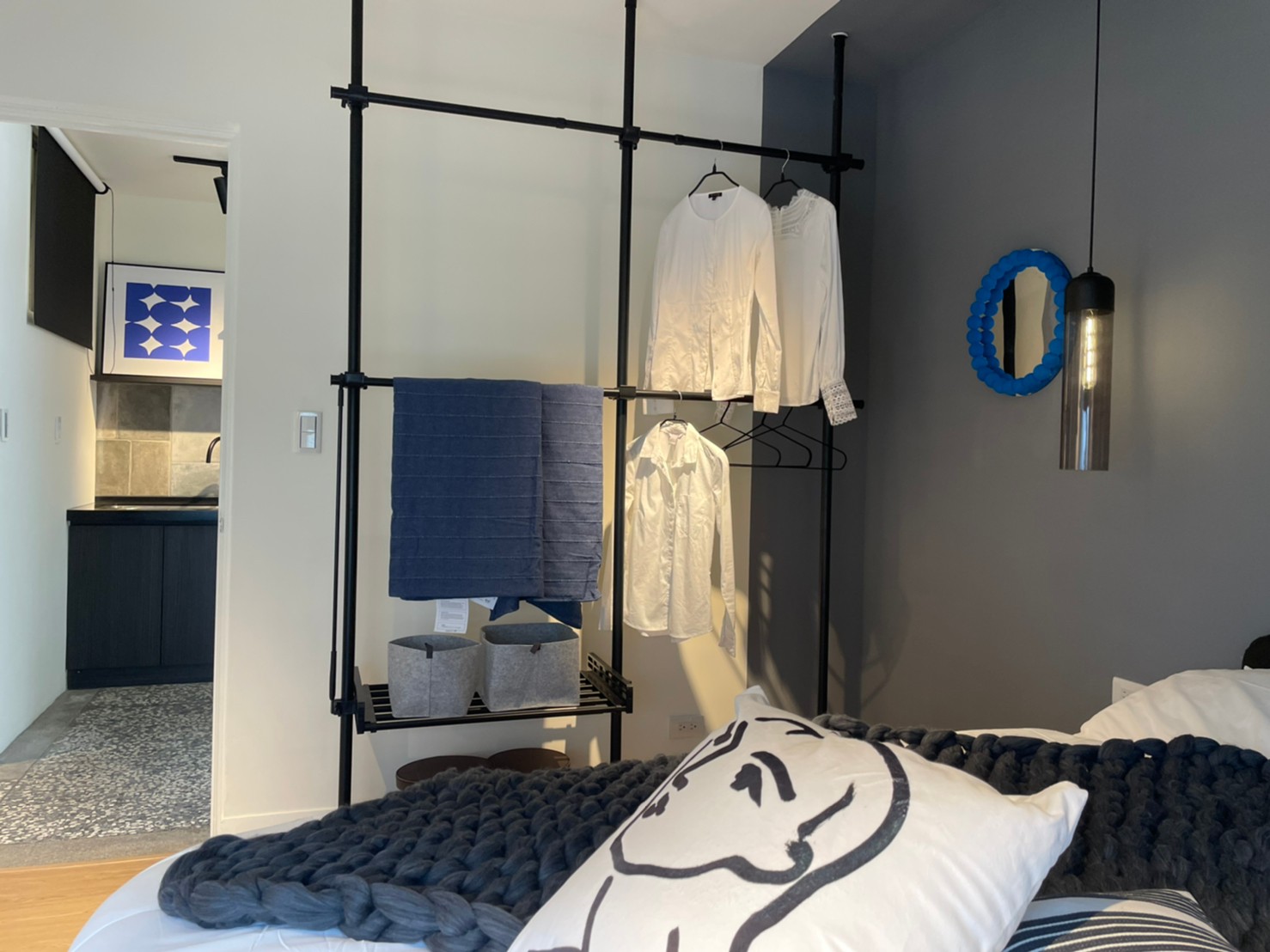 少許的萊茵藍流動進這個臥室。帶出來更多的是深灰色的牆面和蓋毯,所有的情緒舞動隨著它沉澱下來、安靜下來。