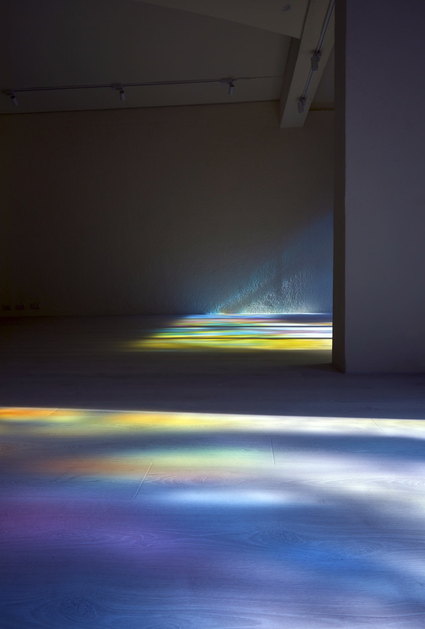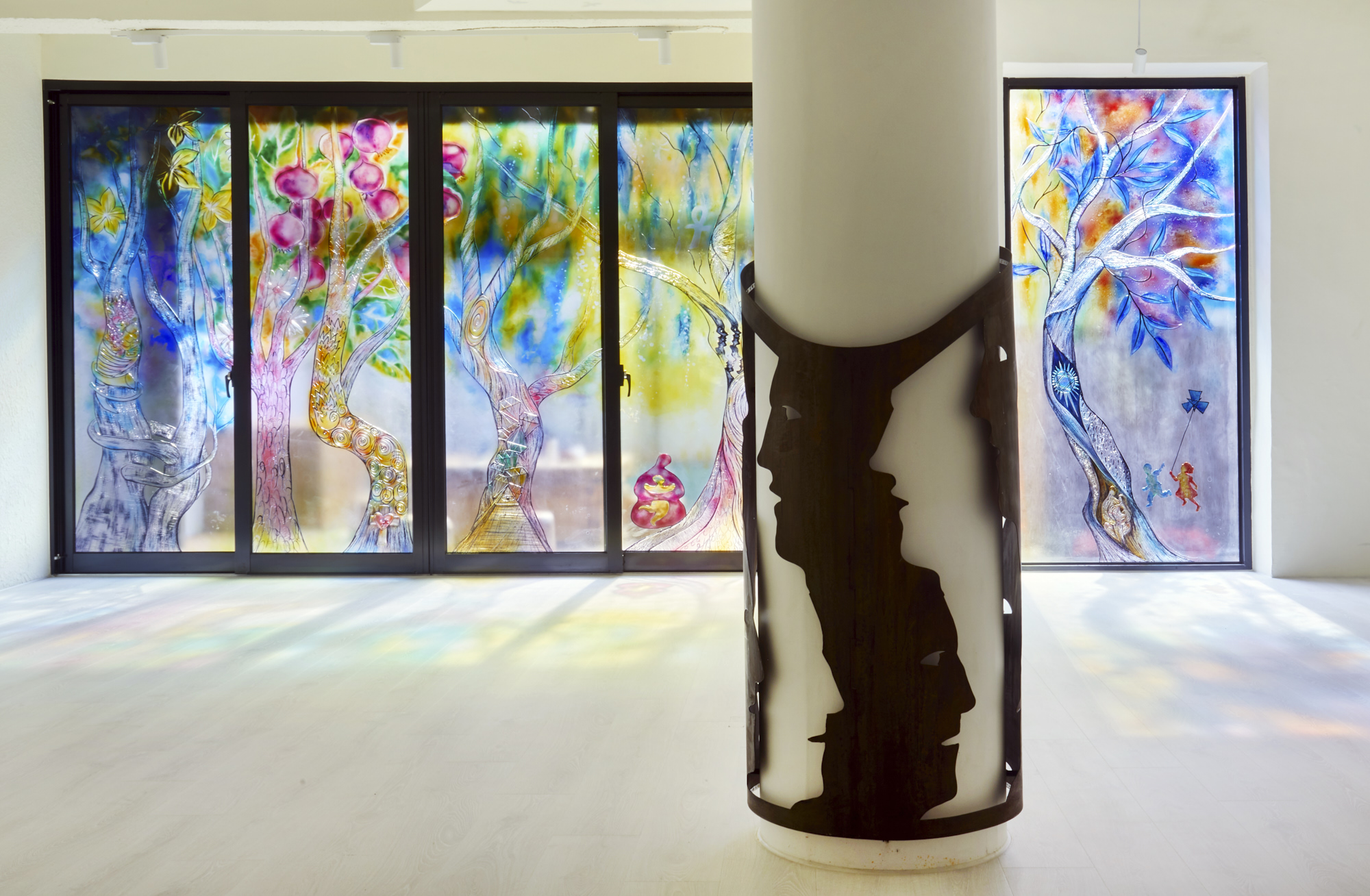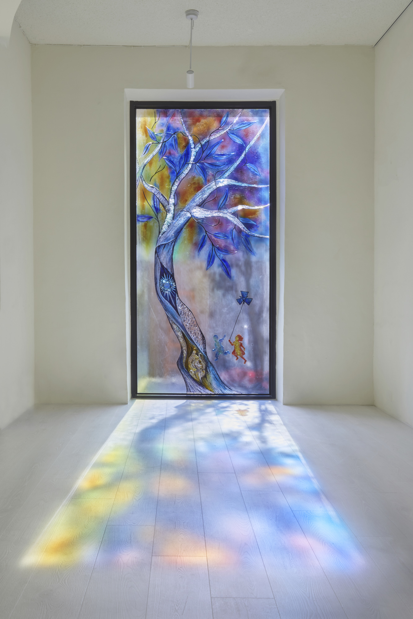 隨後看到的是 1 樓的主空間,是寬闊無比的藝術空間。一整排的彩色玻璃透過光反射到地面的浮動色彩,像是進入了一個超現實的空間,透過色彩、光影及鐵藝的空間表達,進入這個空間的每一個人都強烈感受到一個創意空間竟然可以帶給人這麼大震撼的療癒感受!