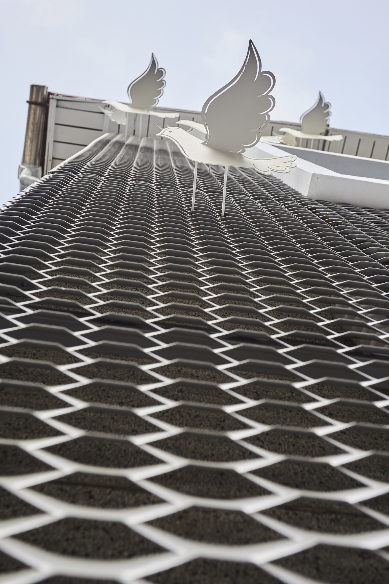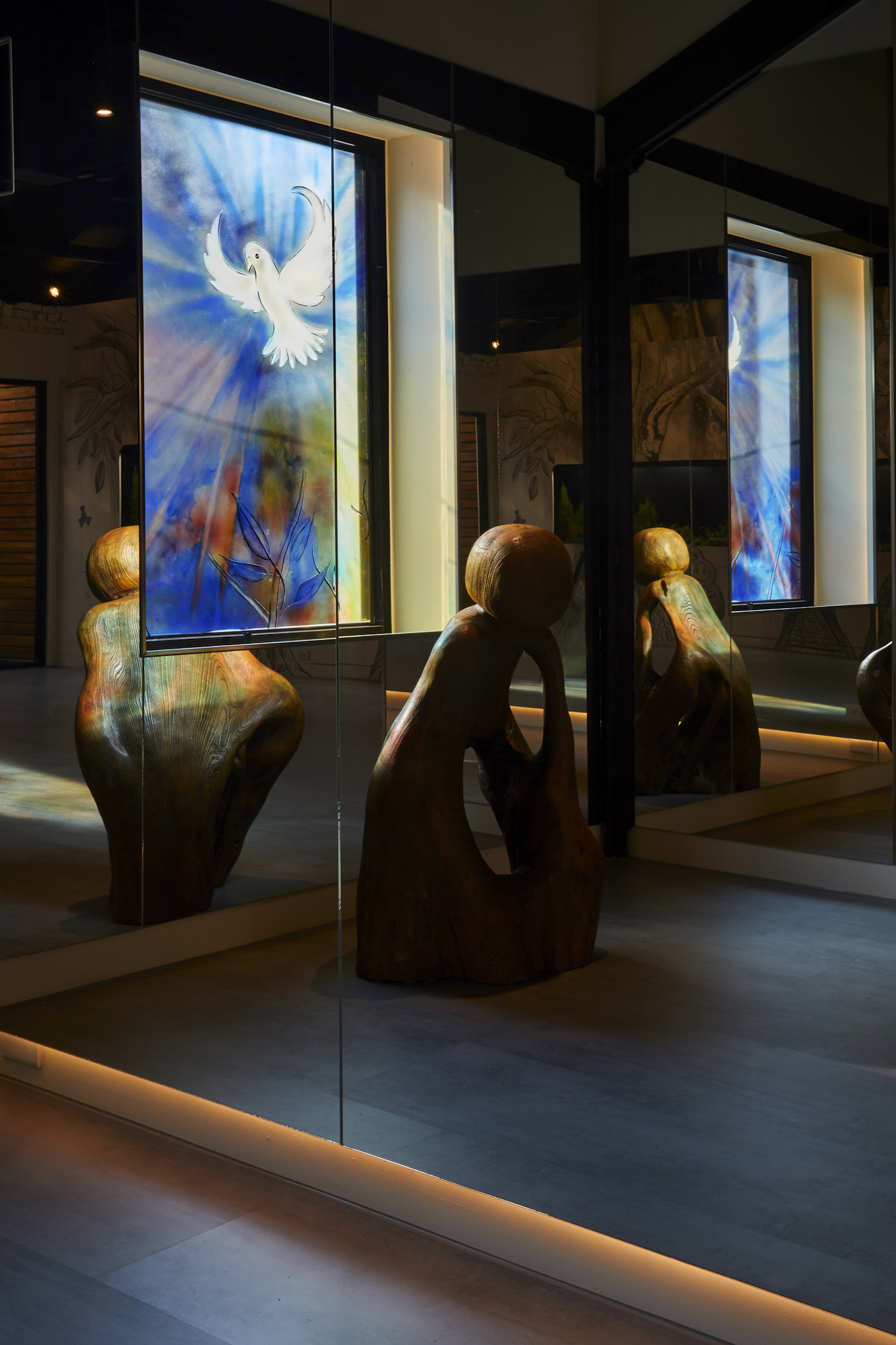 建築物正立面十二支白鴿一路上的迎接引領人們從左邊的小碎石穿孔鐵藝隧道,進入到主體空間的背面出入口。透過牆上的白鴿引領,進入這個神奇的小碎石通道的過程,感覺上經過了一段洗禮和淨化,隨後馬上進入視野的是鏡頭的鐵雕母子圖端景。