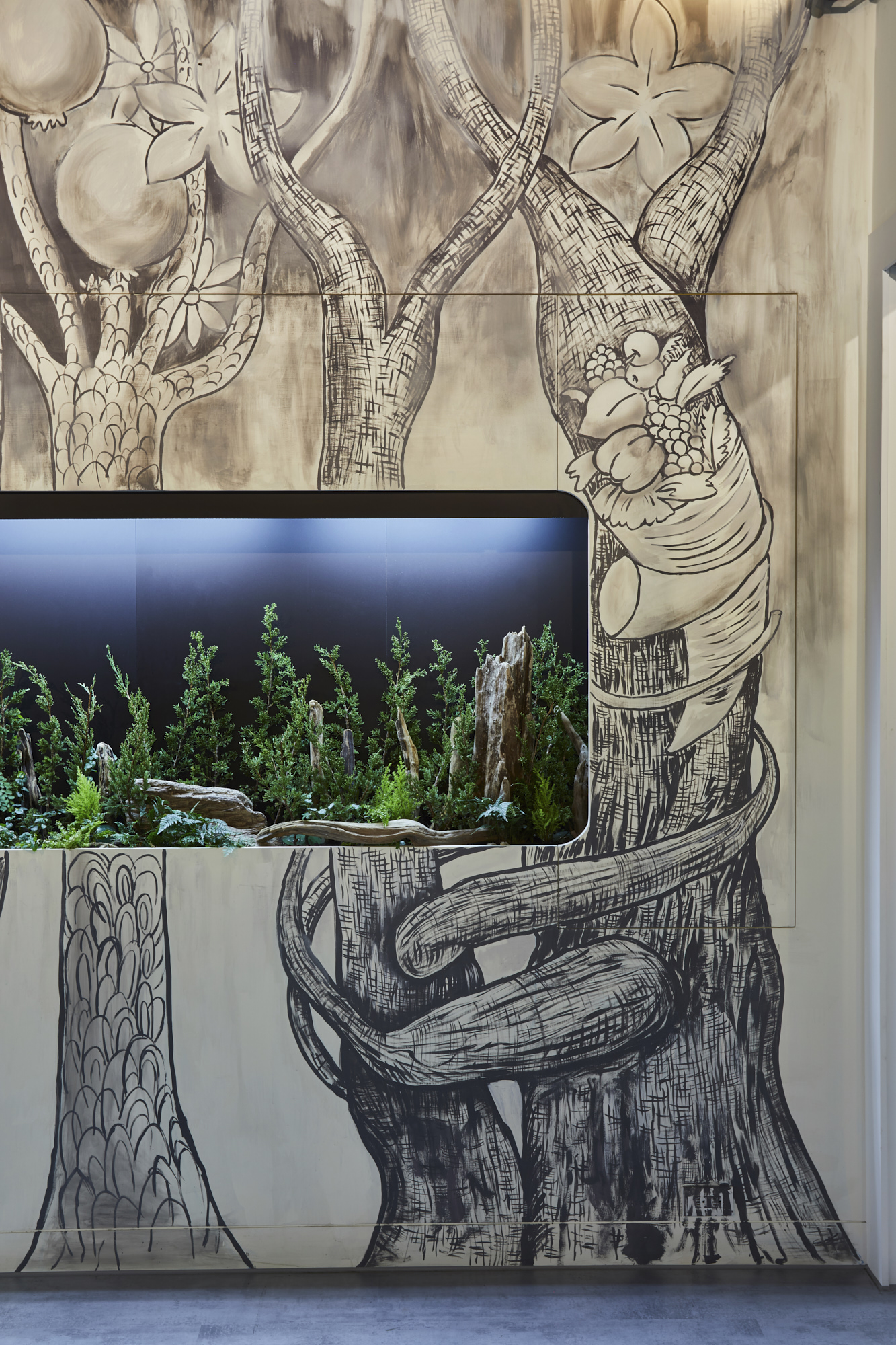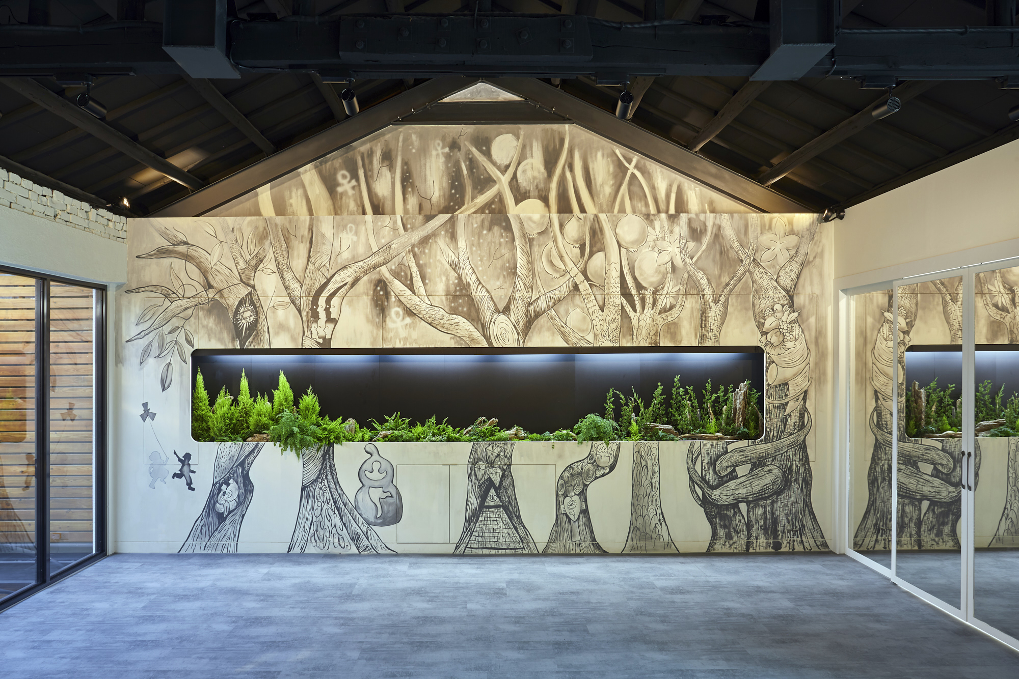 隨著迴旋梯蜿蜒而上,迎面而來兩大面的落地玻璃將整個空間無限拓展,二大面落地鏡牆映射出對牆的手繪黑白森林,投射出夢幻般的感覺~好像,你隨時可以跳進這個奇幻的黑白森林裡隨著它一起舞動起來!